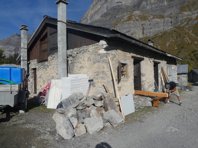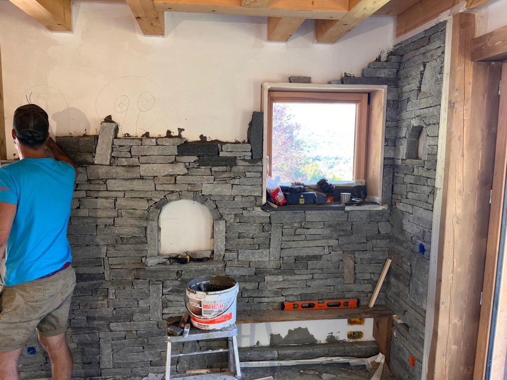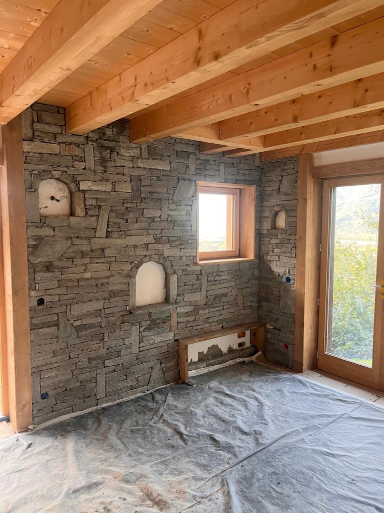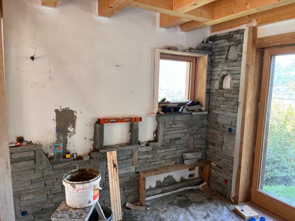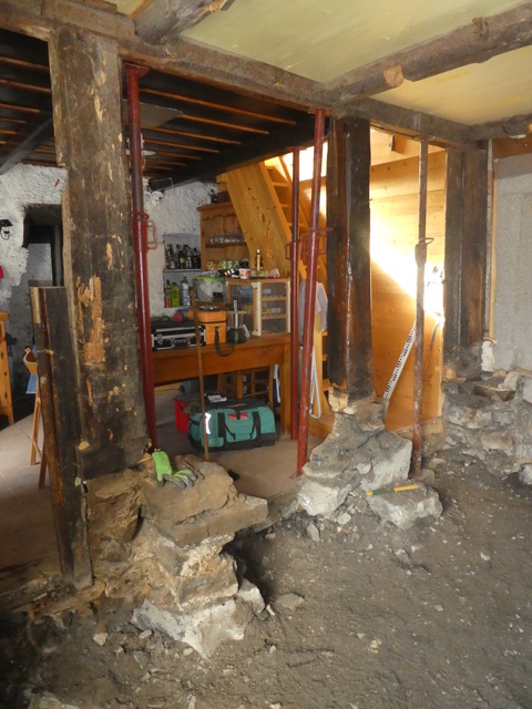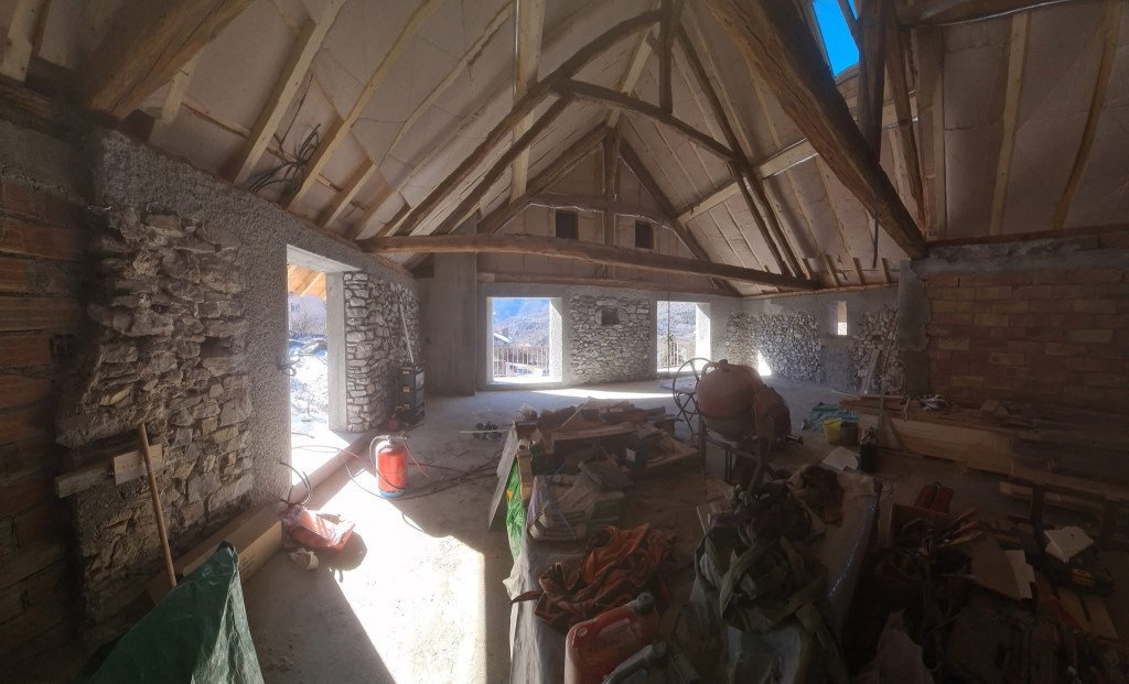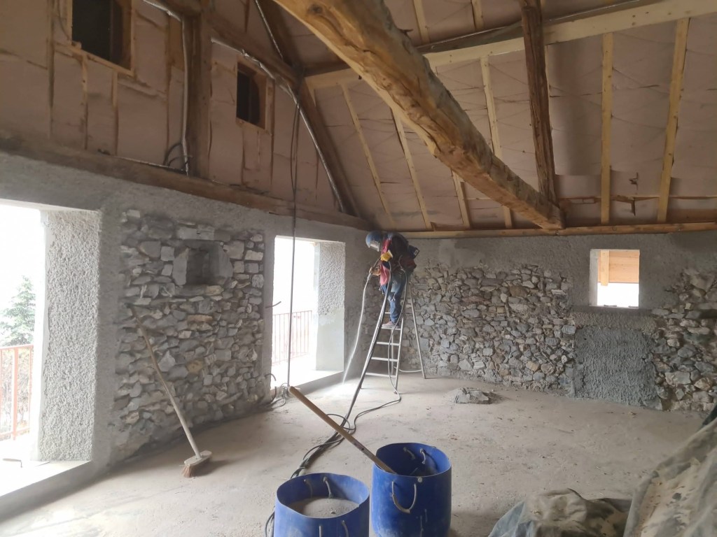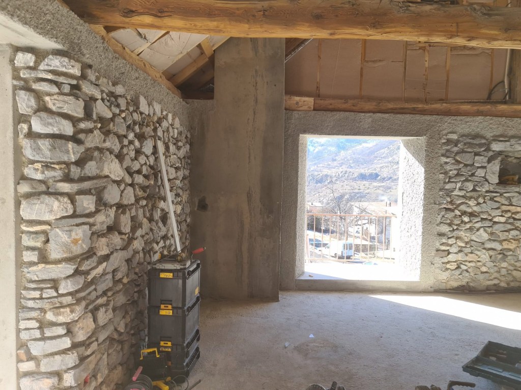 Rénovation d’un chalet en montagne. Démolition des murs en bois, création de murs en béton cellulaire. Changement des poutres porteuses. Décaissement pour isoler le sol et coulage de la dalle.