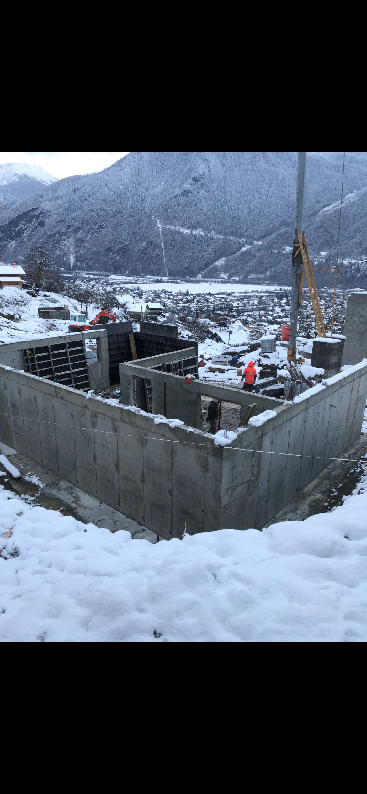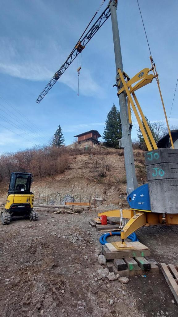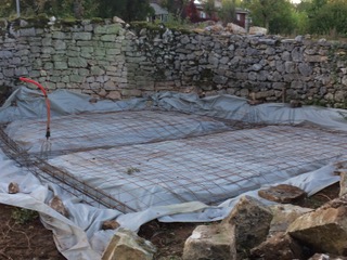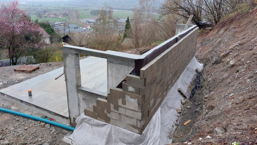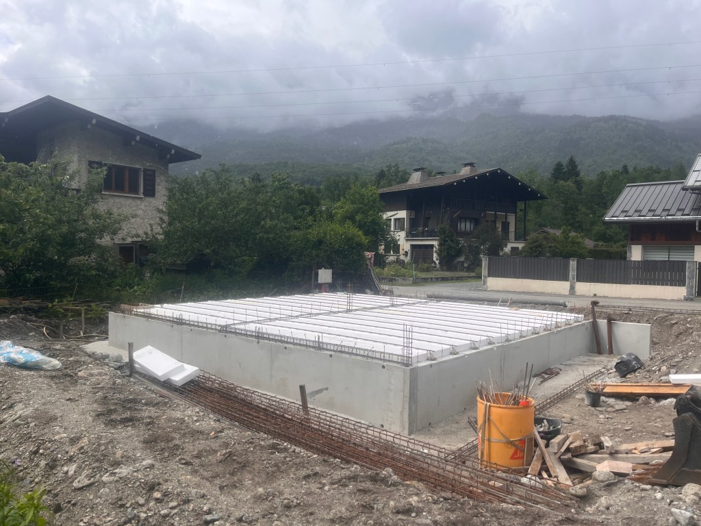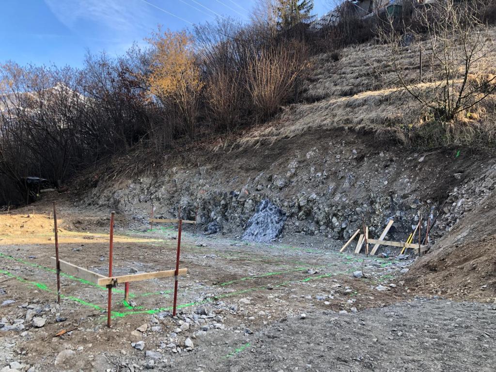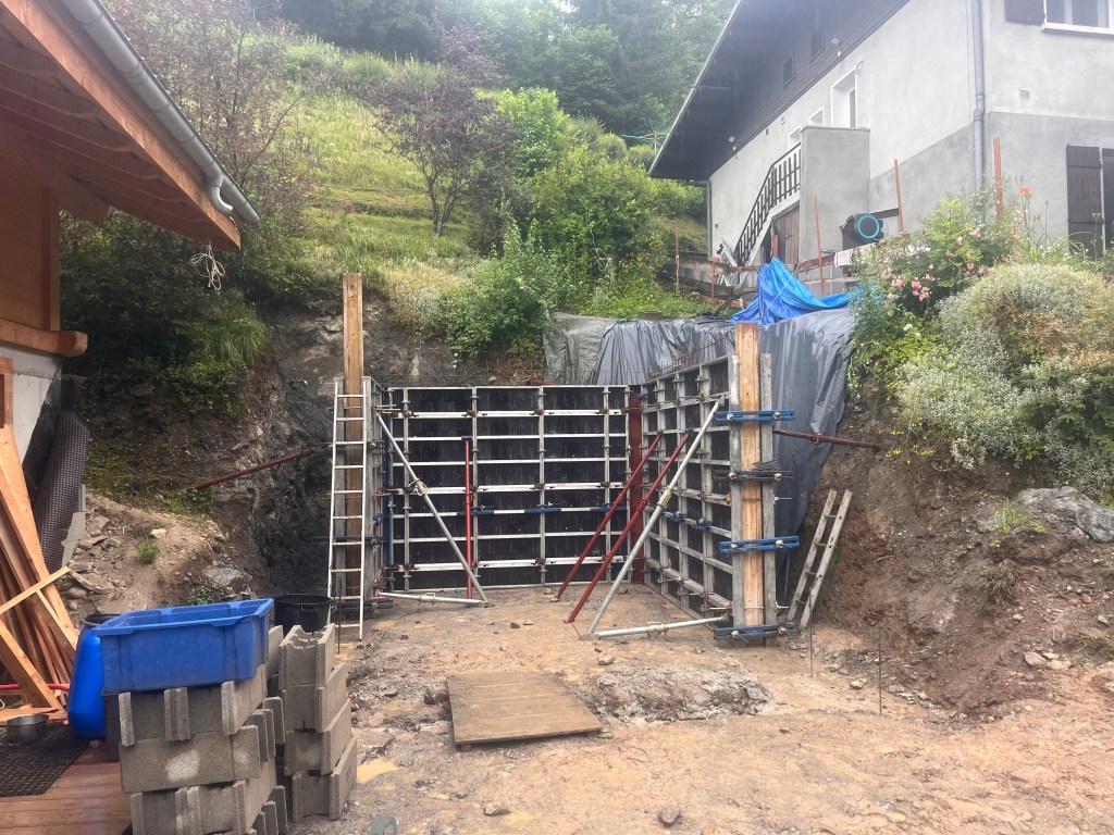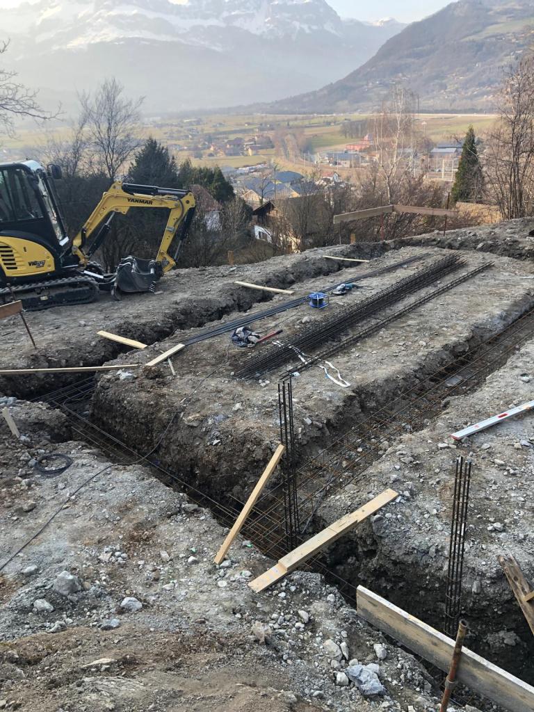 Implantation, creusement des fondations, ferraillage. Coulage d’un mur de soutenement en U et dalles béton. Terrassement du garage, fondation et coulage du béton.