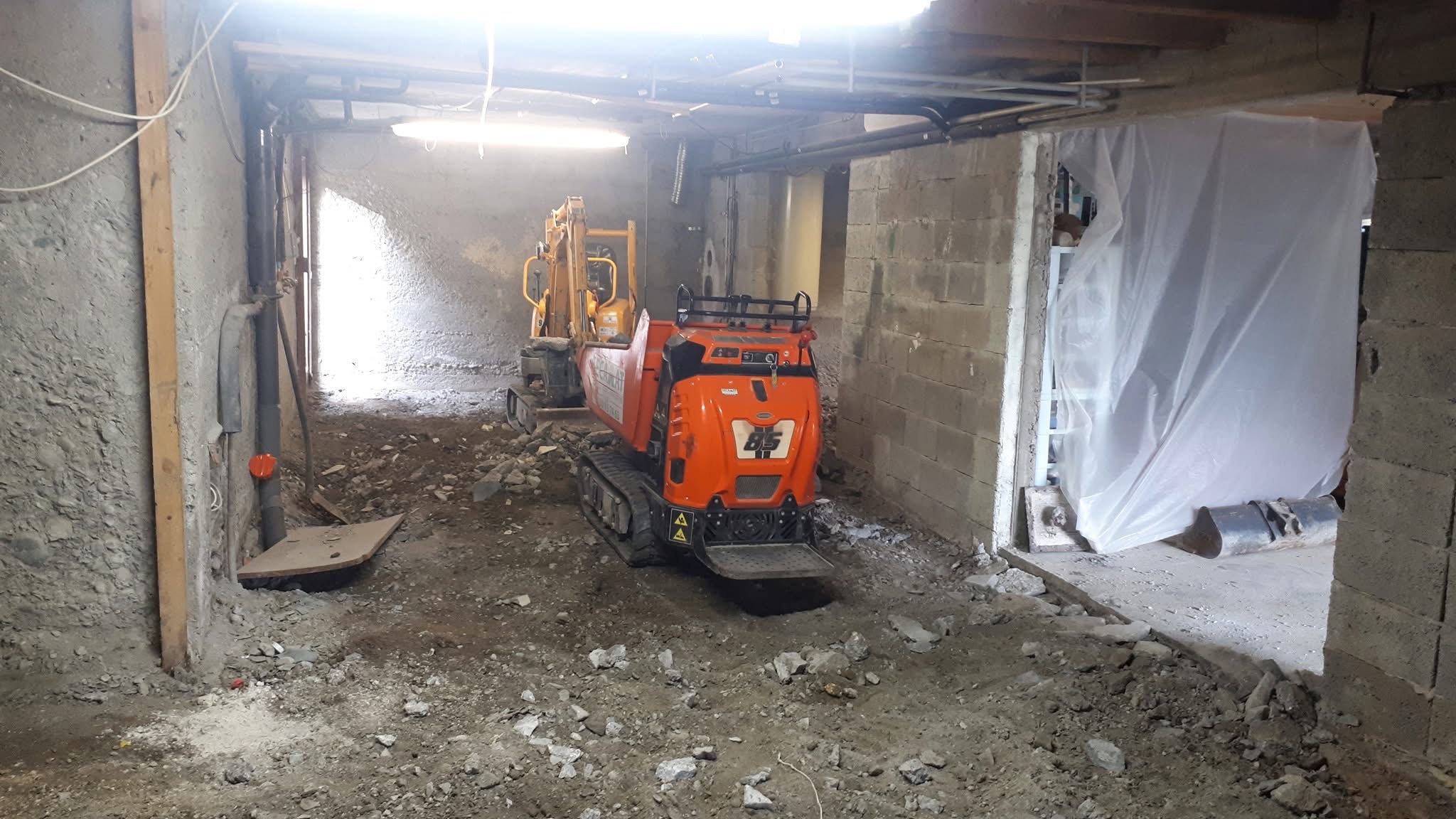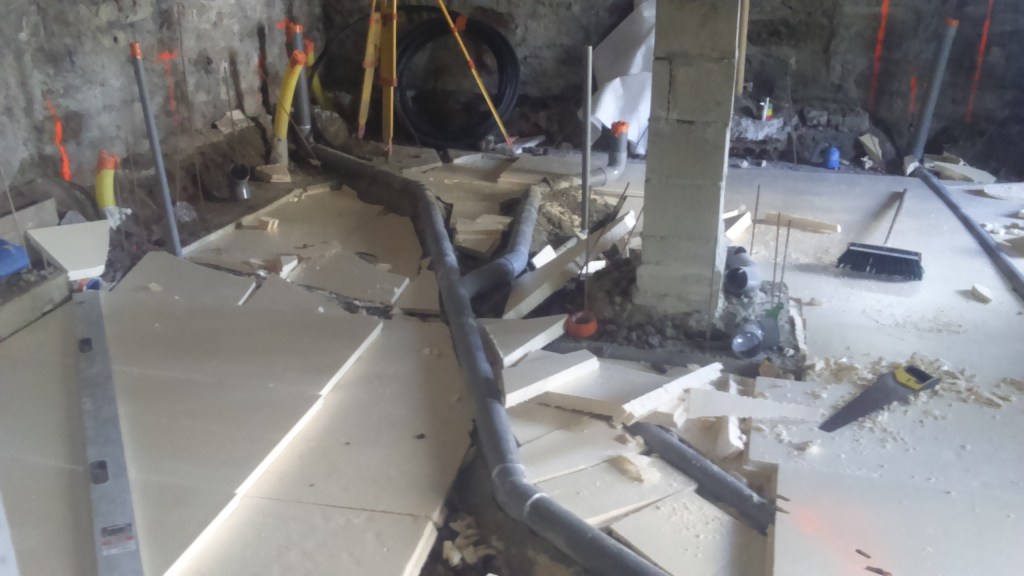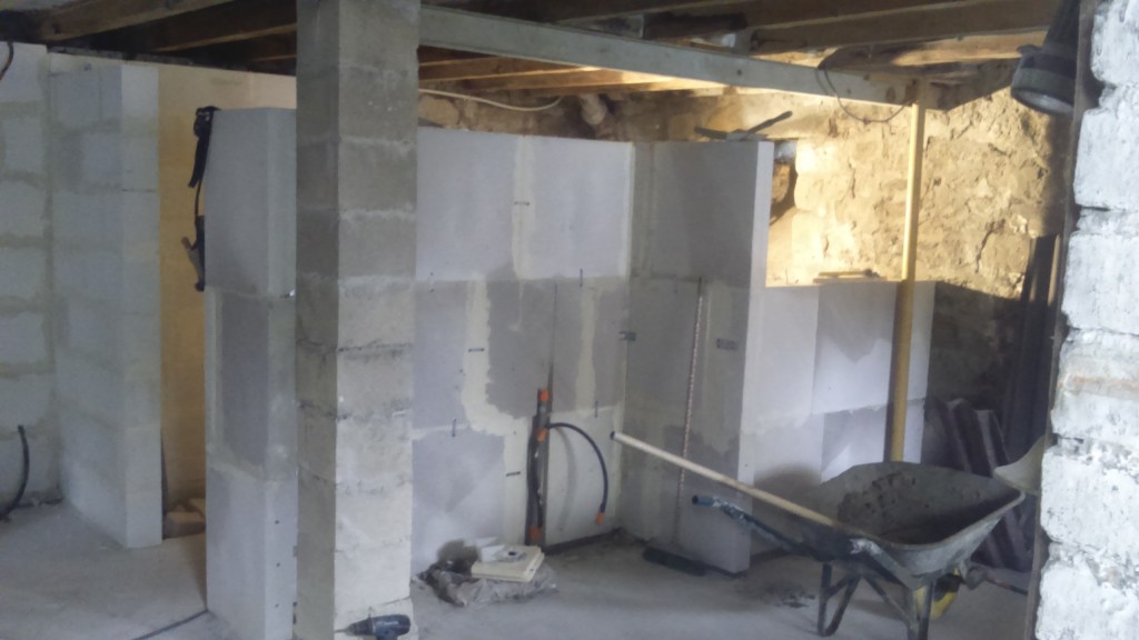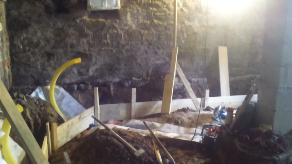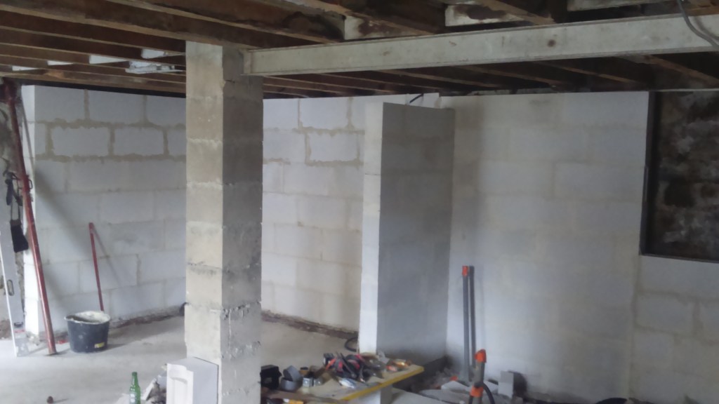 Création d’un appartement en sous sol : décaissement, renforcement des fondations de la maison, mise en place des réseaux et isolation sous dalle. Création d’un système de basse et haute de ventilation derrière le mur de siporex et d’une ouverture dans un mur porteur. Coulage de la dalle.
