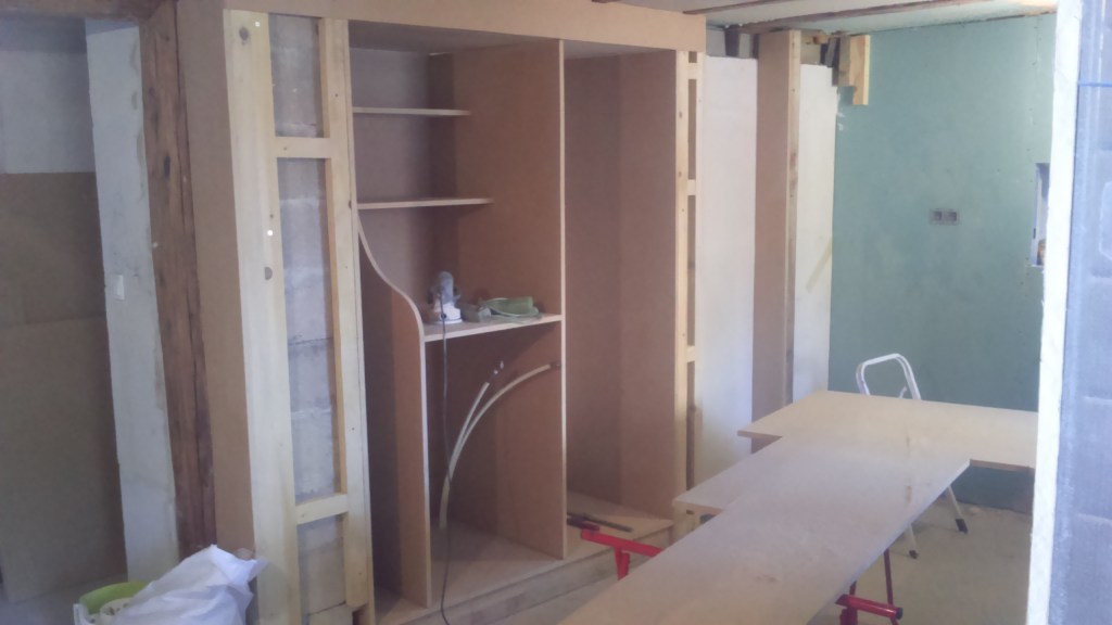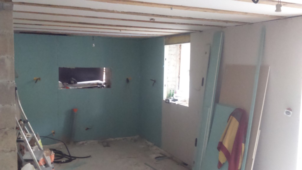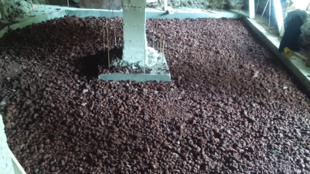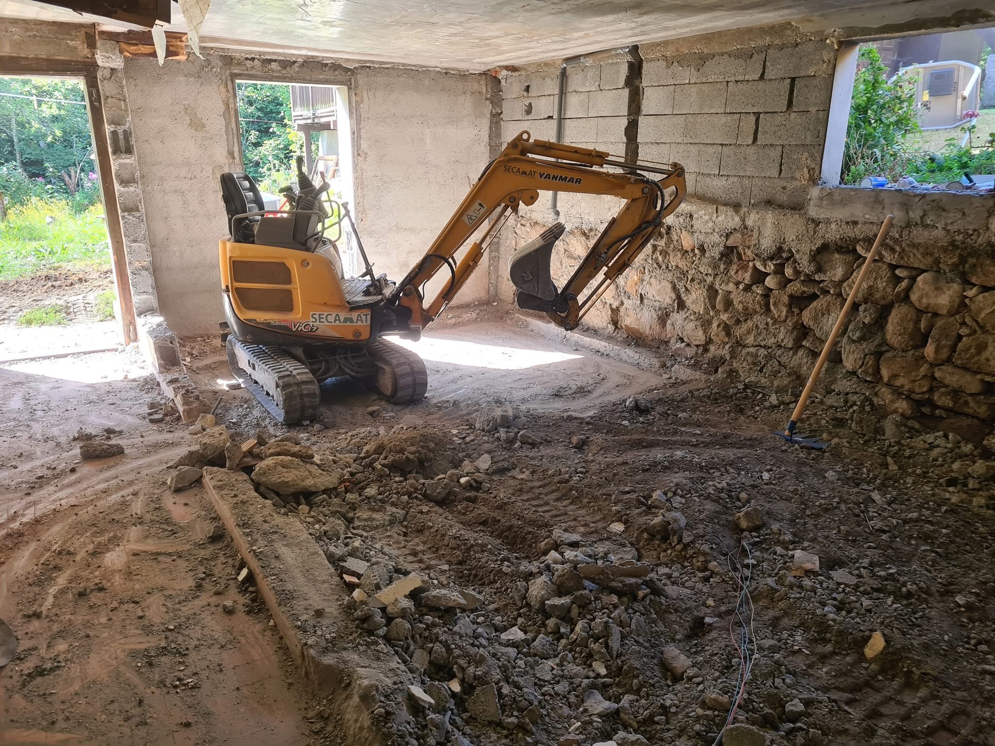 Création d’un appartement en sous sol : décaissement, renforcement des fondations de la maison, mise en place des réseaux et isolation sous dalle. Création d’un système de basse et haute de ventilation derrière le mur de siporex et d’une ouverture dans un mur porteur. Coulage de la dalle.