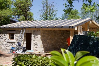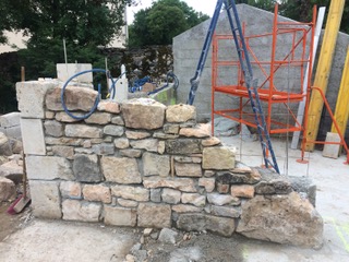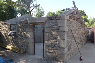 Construction d’un garage en pierre. Taille des jambage, linteau et angle de mur de murs sur places .